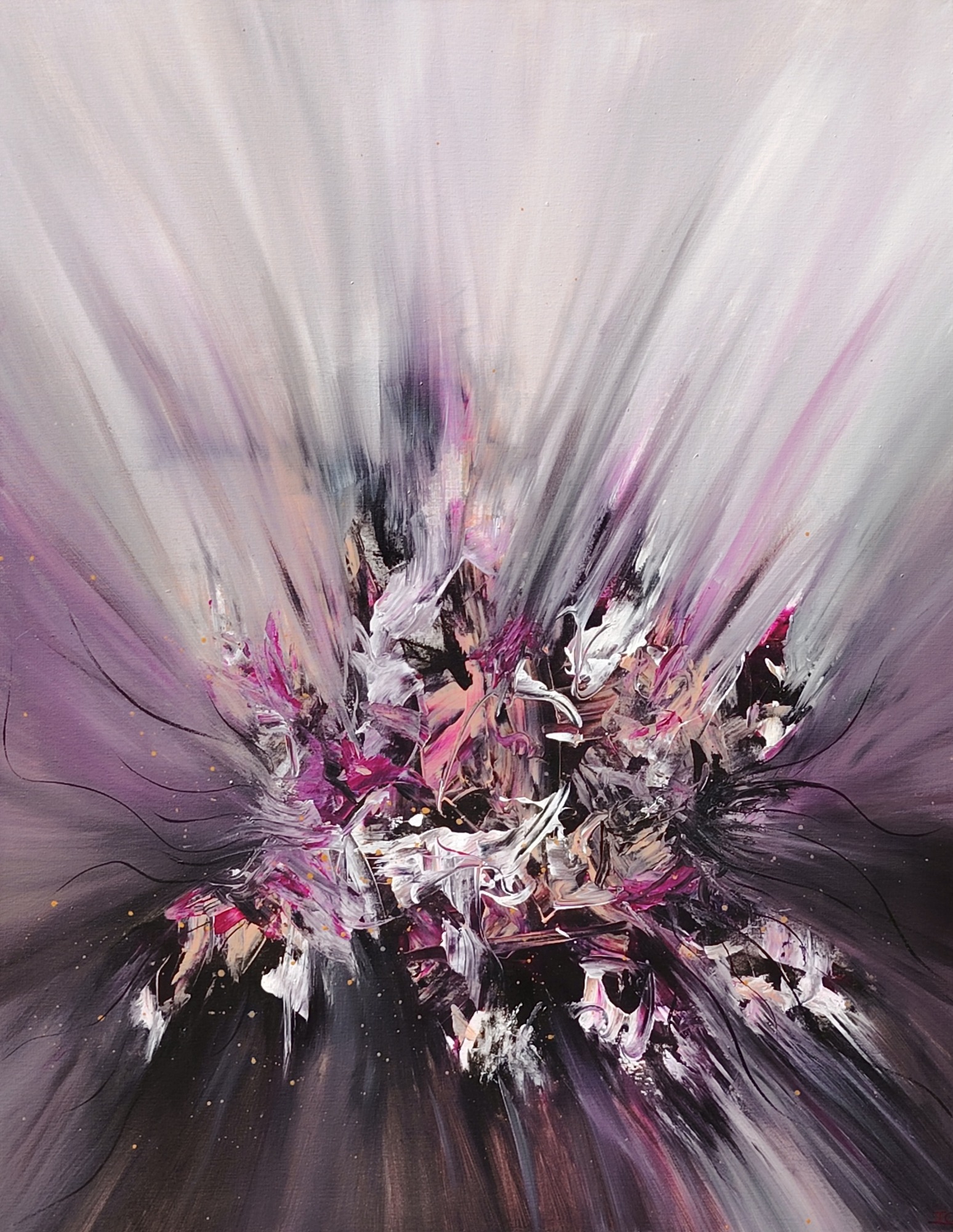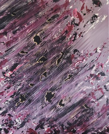 Une explosion d’énergie cosmique, où les teintes pourpres et noires dansent en un mouvement futuriste (46×38 cm)