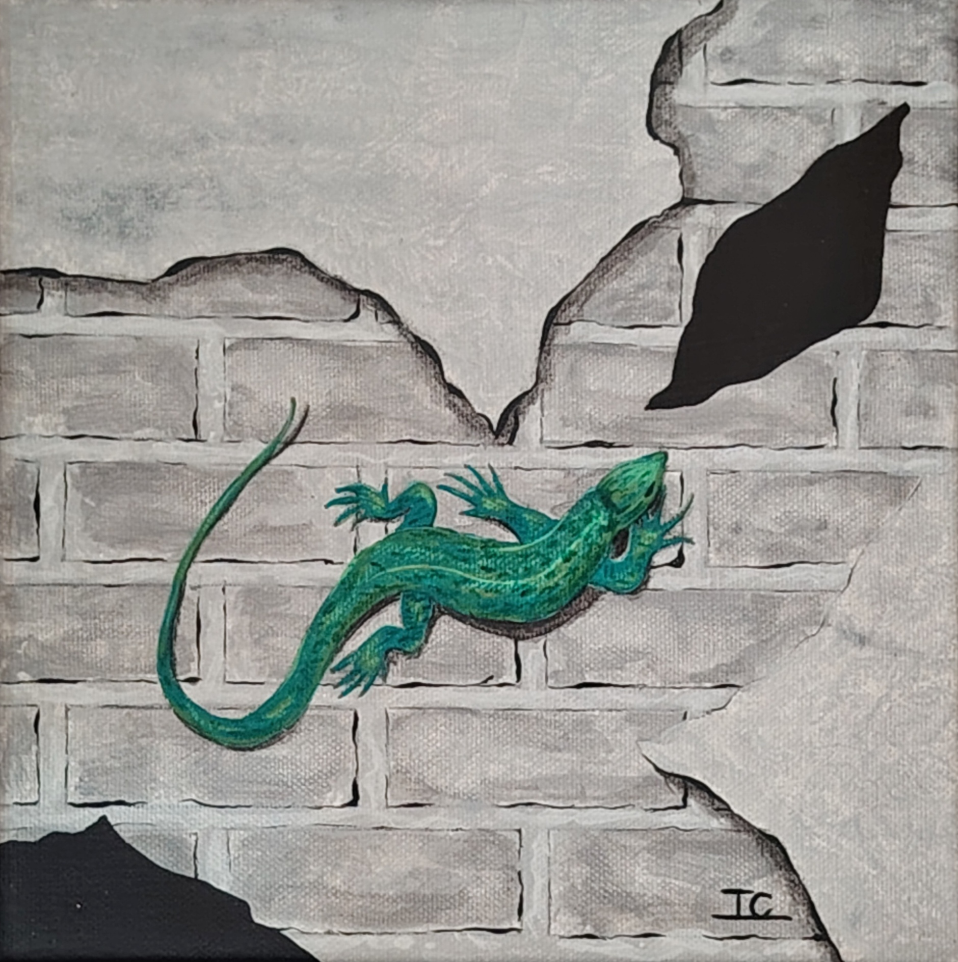 La tension entre présence et absence. Le visage derrière un mur détruit symbolise la curiosité... Collection "The Wall" 61×50 cm.